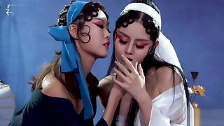 Sultry Asian babe and dark-haired torrid white girl in lesbian action on the bed