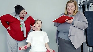 Two BBWs Make a Petite Obedient Teenage Lick Their Thick Twats And Asses In the Gym